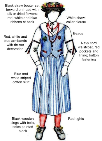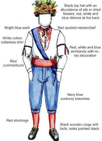 The costumes worn by Barley Brigg consist of red socks, blue breeches, white shirts, blue and red sashes, red and white neckerchiefs and top hats decorated liberally with flowers for the men; red tights or stockings, blue and white striped skirts, white blouses and black straw hats decorated with flowers for the women.